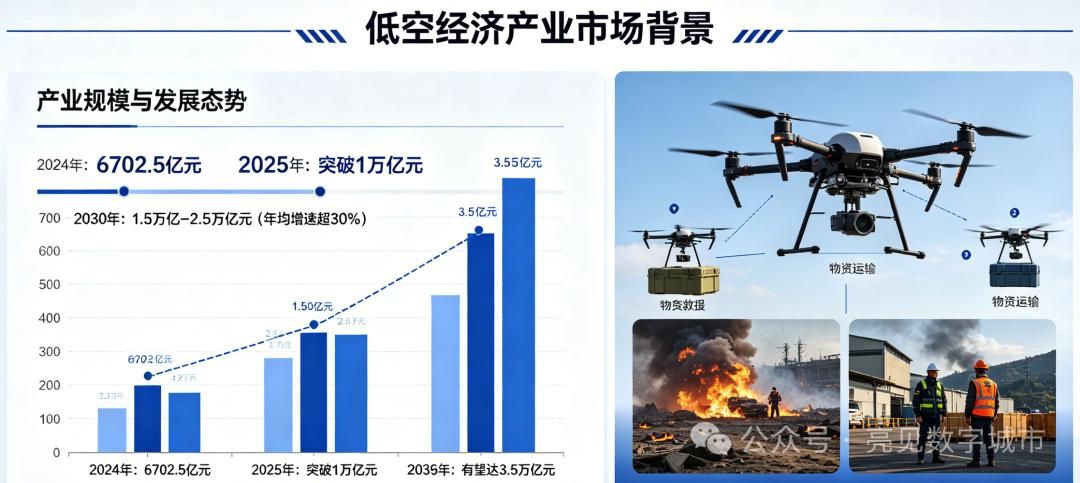 低空经济作为新质生产力的重要代表和战略性新兴产业,正迎来爆发式增长。2024 年全国低空经济市场规模已达6702.5 亿元,2025 年突破1 万亿元大关,预计到 2030 年将达到1.5 万亿至 2.5 万亿元,年均增速超30%,到 2035 年有望达到3.5 万亿元。这一市场规模的快速扩张,为无人机在应急管理领域的广泛应用提供了坚实的产业基础。