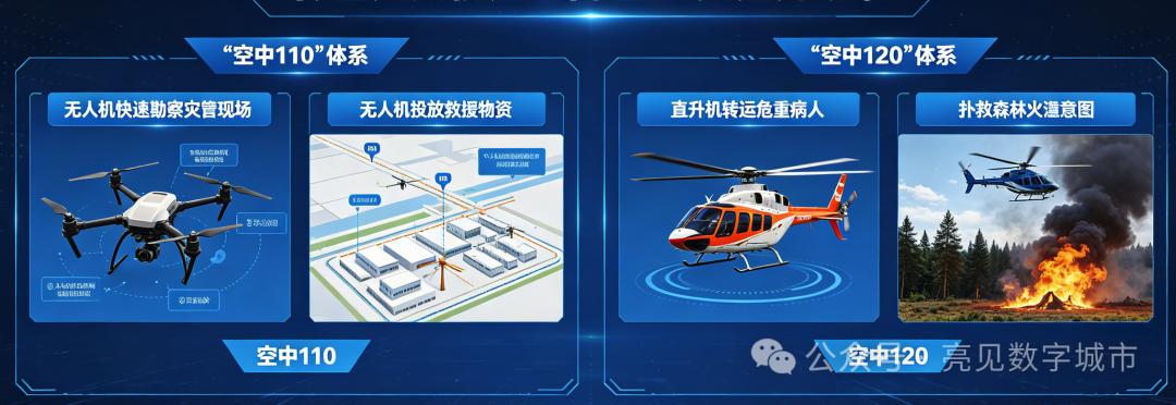 3. 打造 "空中 110"" 空中 120" 体系:推动无人机快速勘察灾害现场、投放救援物资,直升机转运危重病人、扑救森林火灾