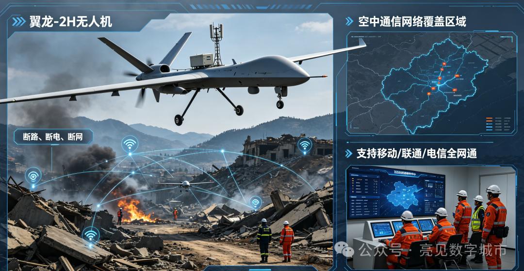 技术特点:大型固定翼无人机(如翼龙 - 2H)搭载通信基站设备,在 "断路、断电、断网" 极端条件下搭建空中通信网络。