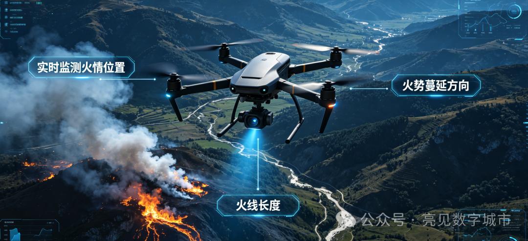 技术特点:无人机搭载光电吊舱、热成像相机、激光测距仪,实时监测火情位置、火势蔓延方向、火线长度等关键信息。