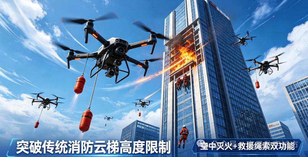 技术特点:无人机蜂巢编队、大载重无人机搭载灭火弹与救援绳索,突破传统消防云梯150 米高度限制。