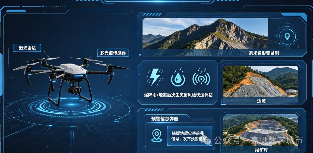 技术特点:无人机搭载激光雷达、多光谱传感器,对山体、边坡、尾矿库等进行毫米级形变监测,捕捉地质灾害前兆信号。