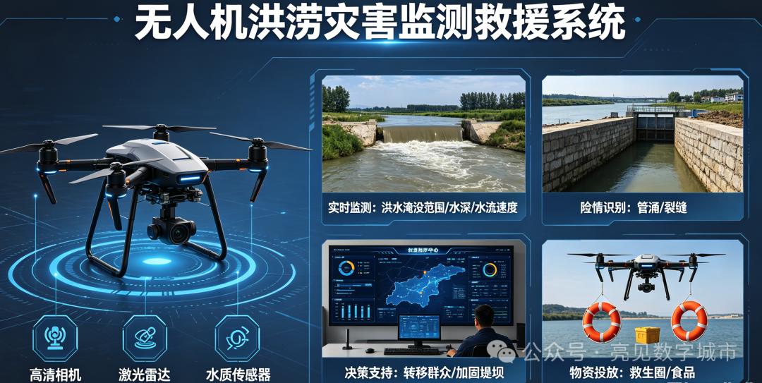 技术特点:无人机搭载高清相机、激光雷达、水质传感器,对洪水淹没范围、水深、水流速度、堤坝险情等进行实时监测。