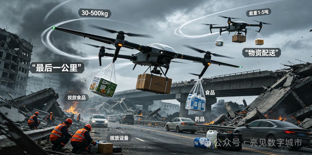 技术特点:大载重无人机(30-500 公斤)、固定翼无人机(载重 1-5 吨)搭载物资投放装置,突破地形限制,实现 "最后一公里" 物资配送。