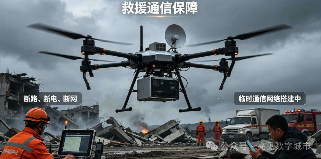技术特点:大型无人机搭载移动通信基站、卫星通信设备,在灾害现场快速搭建临时通信网络。