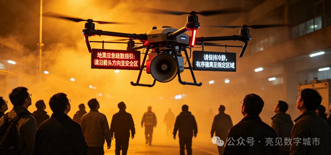 典型案例:某城市化工园区爆炸事故中,无人机群在 5 分钟内覆盖 10 平方公里区域,通过高音喇叭和 LED 显示屏发布疏散指令,指引群众向安全区域撤离,30 分钟内完成 2 万余名群众疏散,无一人伤亡。某大型活动现场突发火灾,无人机快速升空,引导观众从安全出口疏散,疏散时间缩短 40%。
