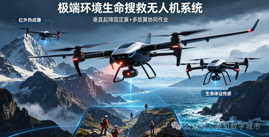 技术特点:垂直起降固定翼无人机、多旋翼无人机搭载红外热成像、生命体征传感器,适应高山、峡谷、海洋等极端环境。
